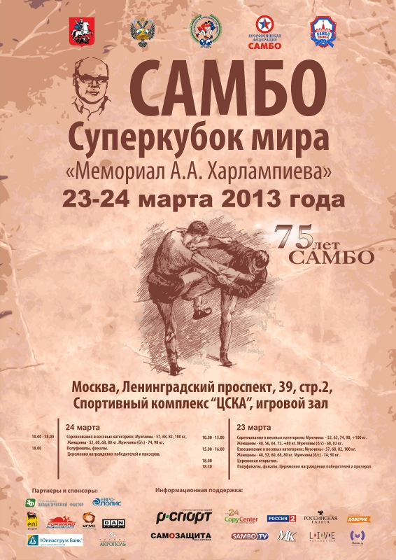 с 22-го по 25 марта 2013 года в Москве в спортивном комплексе "Игровой" в ЦСКА пройдет этап Кубка мира по самбо "Мемориал А. Харлампиева" среди мужчин и женщин по спортивному и боевому самбо. Положение.